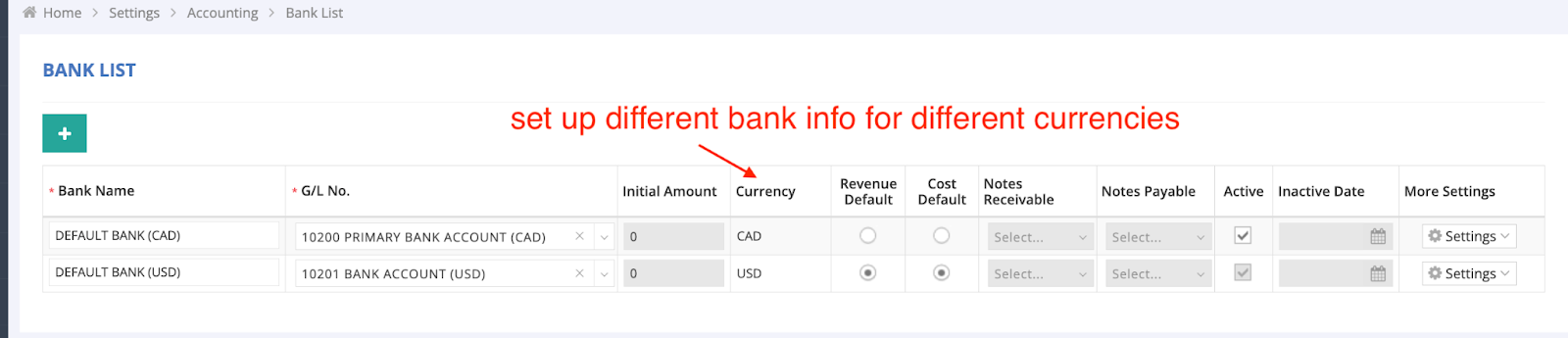 - Navigate to: Settings > Accounting > Bank List