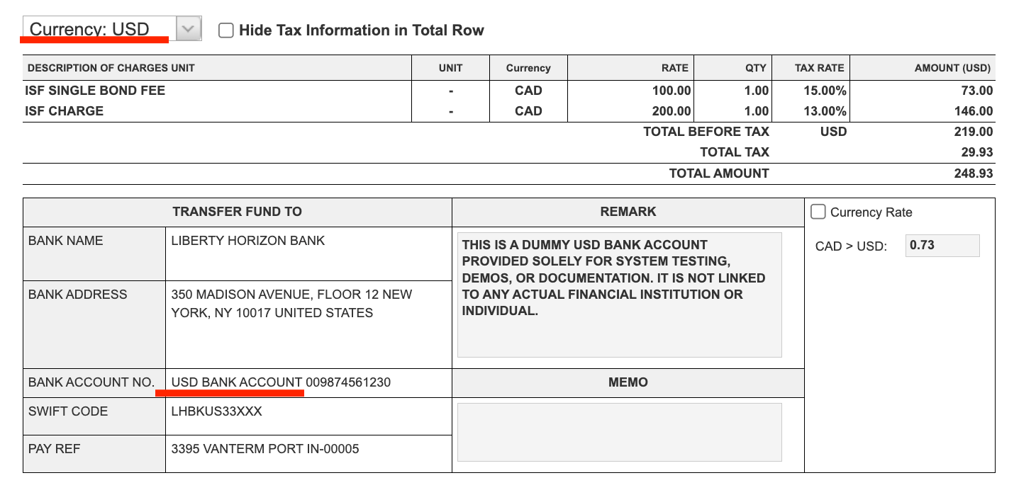 - Example: If the main currency is USD, the invoice will display the USD bank account remark.