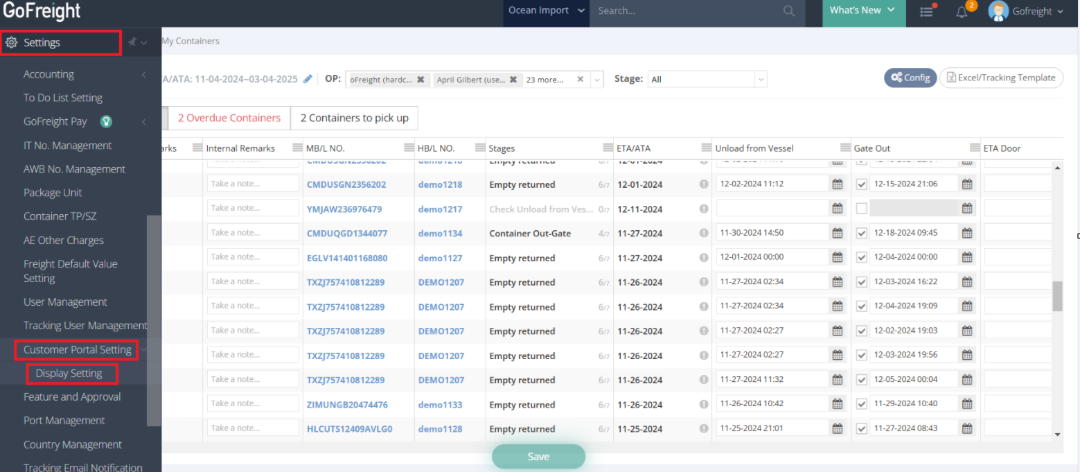 - Go to GoFreight Settings and navigate to Display Setting under Customer Portal Settings.