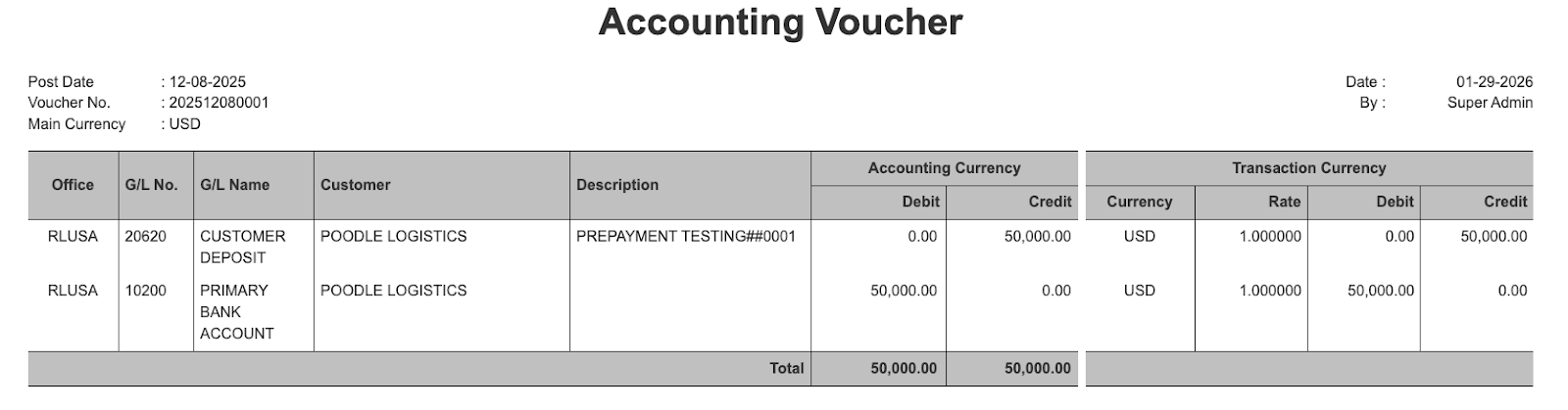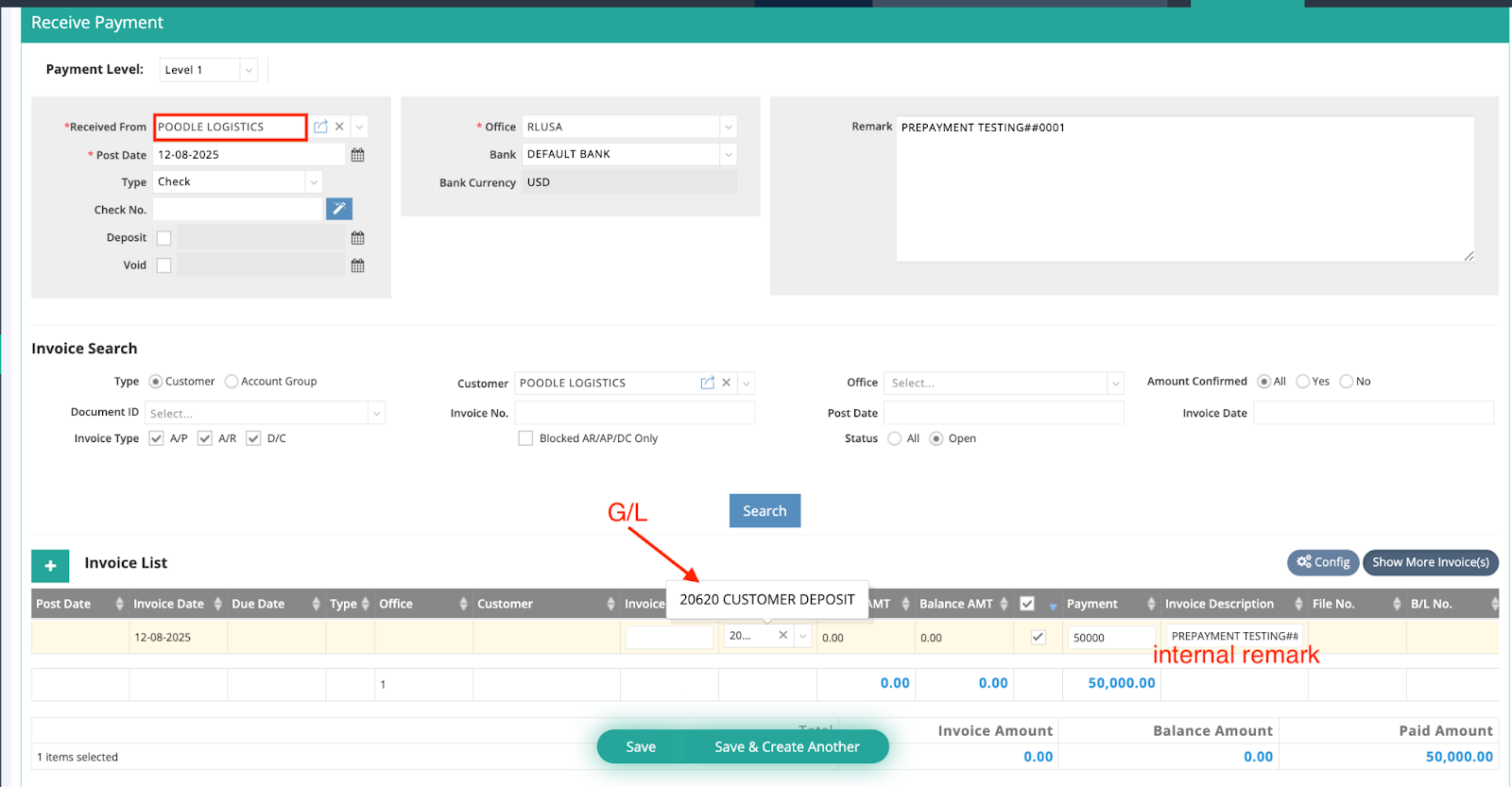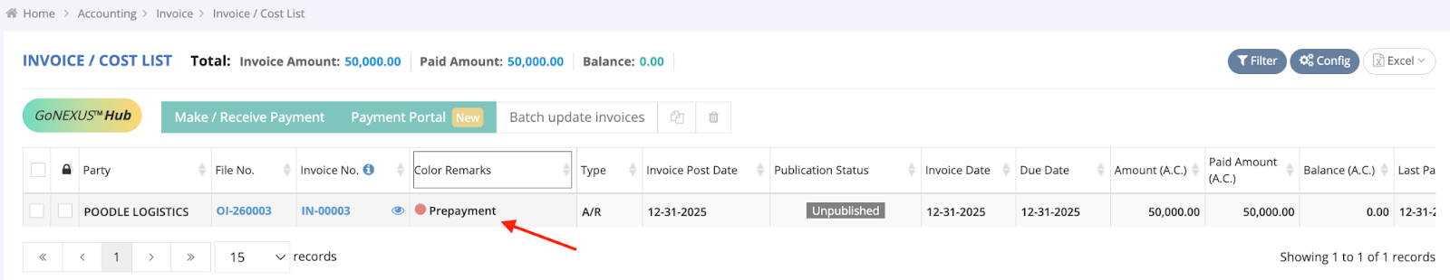 Since this is for logistics, consider mentioning House Bill (HBL) or Job Numbers. We suggest users paste the Job No. in the prepayment Internal Remark description for easier tracking later.