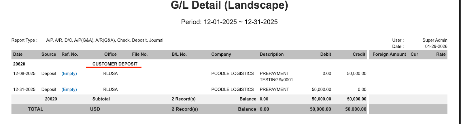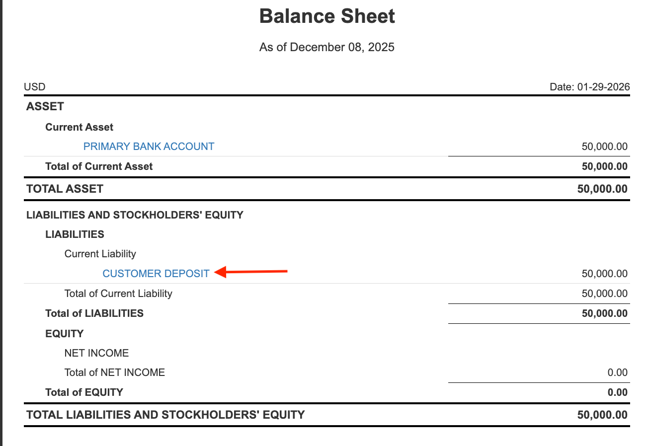 - The amount appears under Customer Deposit (Liability) on the Balance Sheet