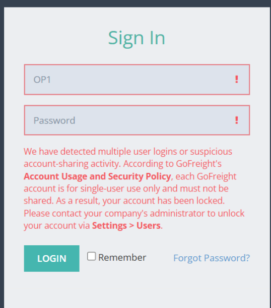 To help keep your account secure, GoFreight continuously monitors for unusual or potentially risky activity. If something out of the ordinary is detected, the system may temporarily lock the affected account as a precaution.