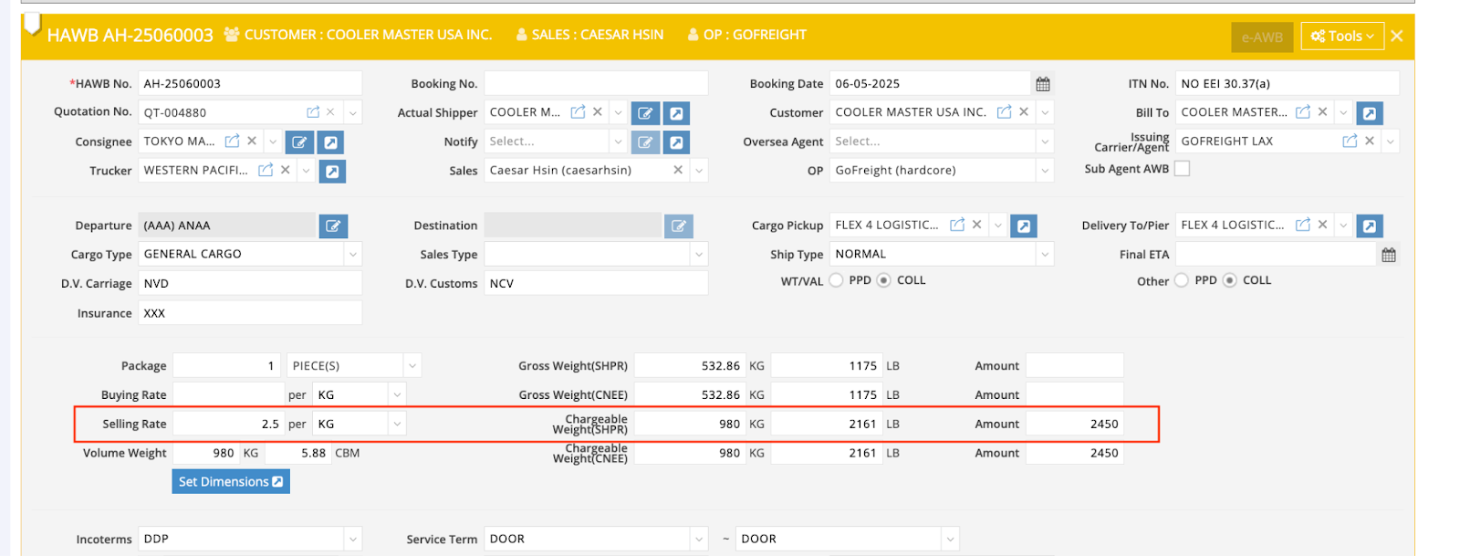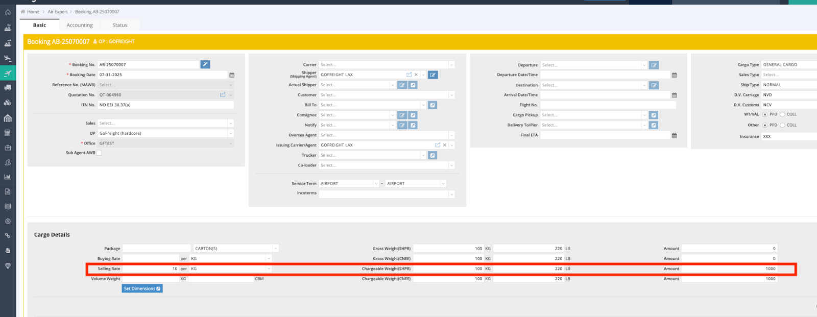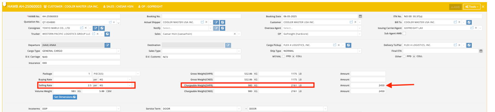 - Go to Air Export > New Shipment and input HAWB details: Selling Rate, Chargeable Weight (SHPR), and Other Charges.