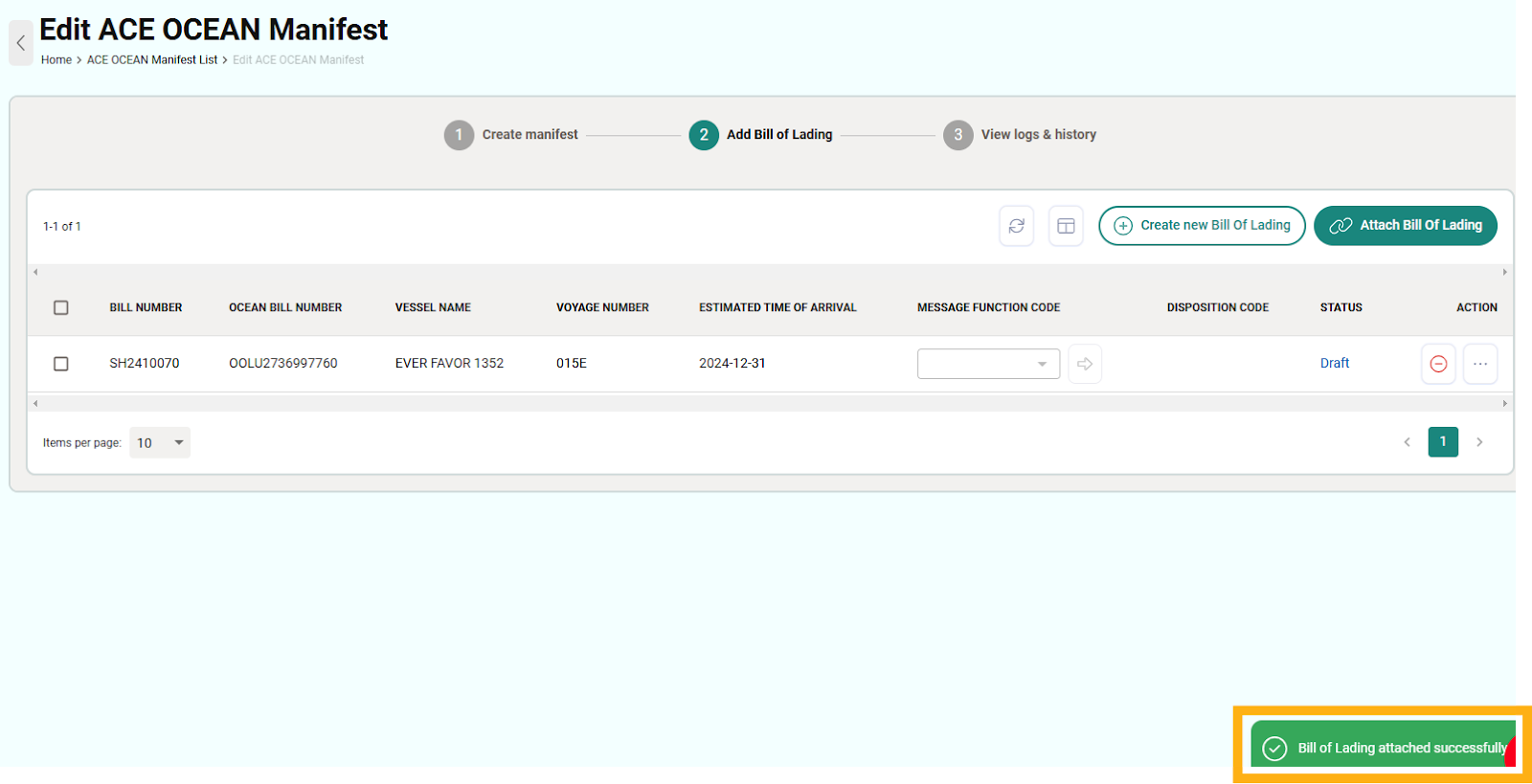 5. Once the bill of lading has been attached to the Manifest, there will be a pop-up notice showing “attached successfully” at the bottom of the page.