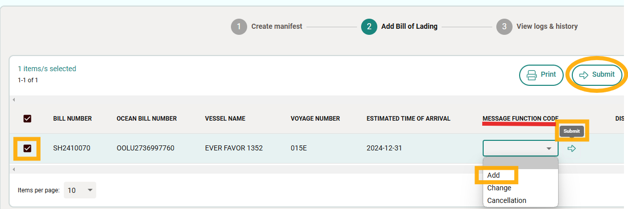 6. Check on the Bill of Lading and Select “Add” under “MESSAGE FUNCTION CODE”