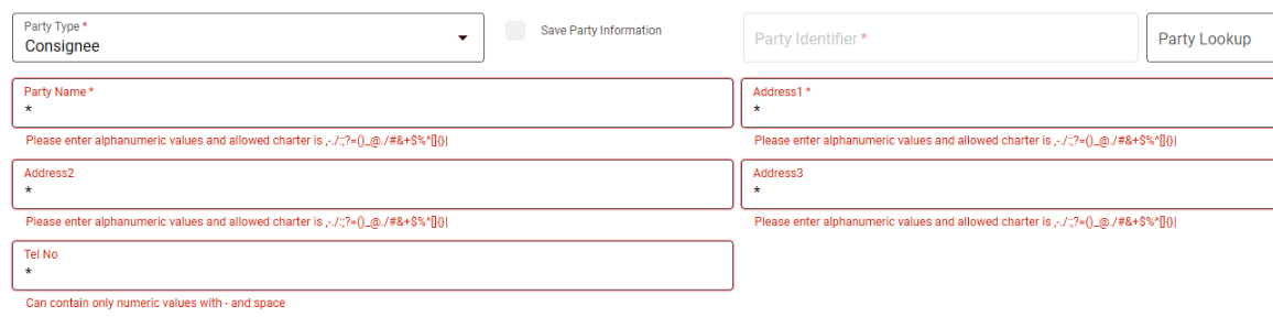 The Shipper, Consignee, and Marks of Goods Description fields have character limits and restrictions on certain special characters.