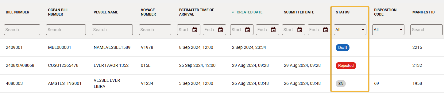 Both the Manifest and Bill of Lading List views have a column that displays the AMS status.