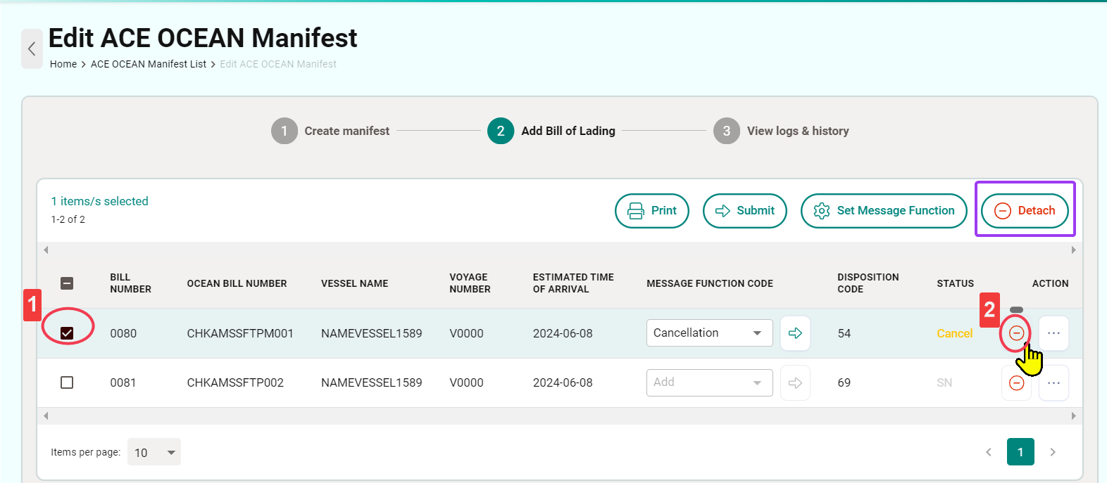 - Click “ 2 Add Bill of Lading” on the top and tick the checkbox of Bill Of Lading to be modified/edited.