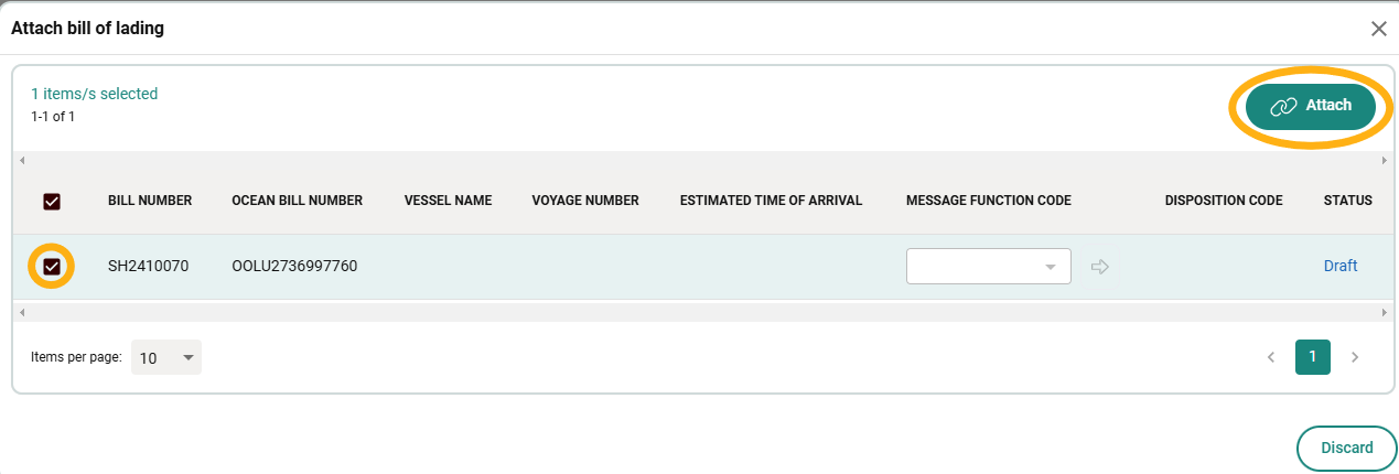 - Select the Bill of Lading and click on Attach.