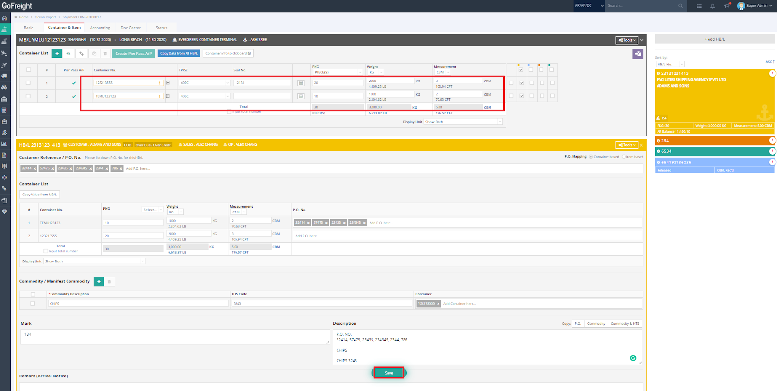 3. Complete the "Mark and Description of Goods" information for the HB/L below, then click “Save”. Repeat this process for any remaining HB/Ls to assign them to containers and enter their PKG/Weight/Measurement.