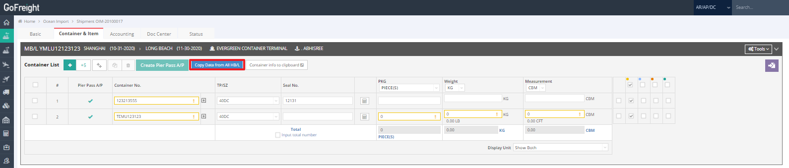4. Lastly, scroll up to the MB/L and click “Copy Data from All HB/L”.