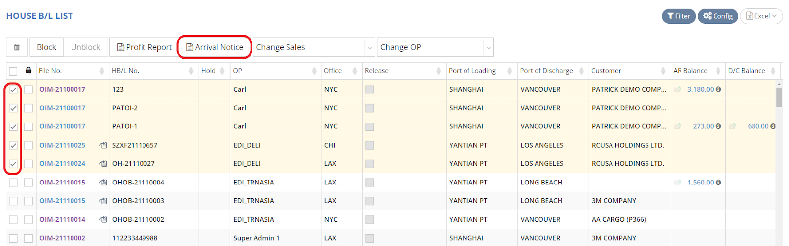 - In the “House B/L List” (House Bill of Lading List), select the multiple shipments for which you wish to send, download, or print arrival notices in the first column, then click on the “Arrival Notice” button.