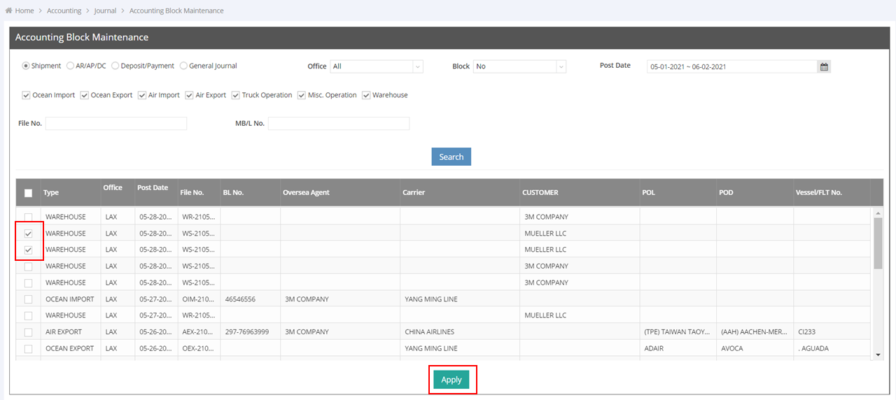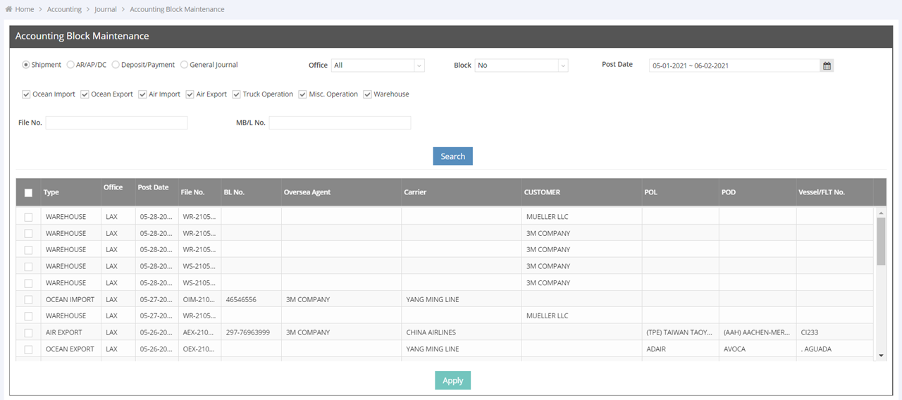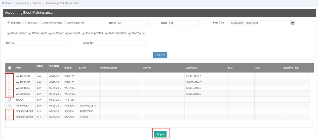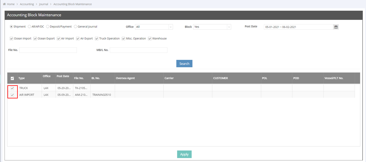 5. Click “Apply” to block the selected items.Note: If you choose "Shipment" to apply an Accounting Block, both the shipment and the associated accounting records will be locked and cannot be modified. If you select AR/AP/DC, Deposit/Payment, or General Journal, only the accounting section will be locked and cannot be modified.