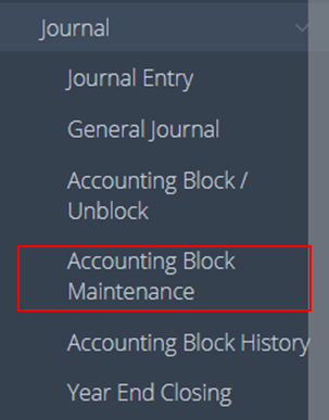 1. Navigate to “Accounting” > “Journal” > “Accounting Block Maintenance” in the navigation bar.