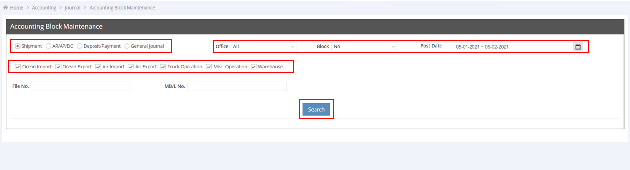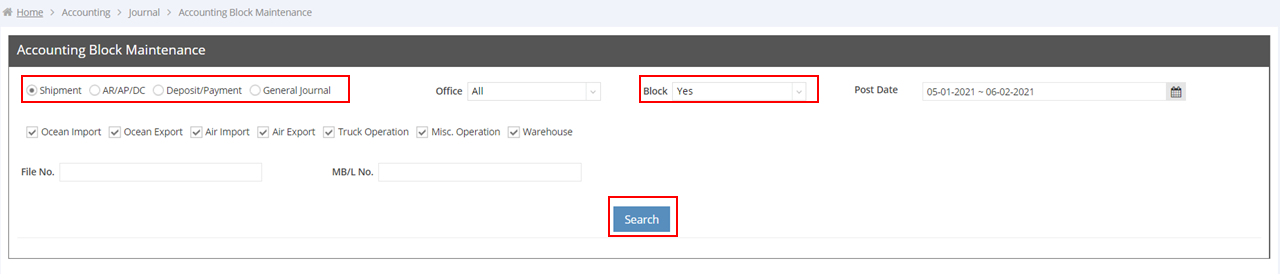 If you are an authorized user, you can easily block accounting data in batch by files in GoFreight by using the feature “Accounting Block Maintenance”. Here’s how to do it: