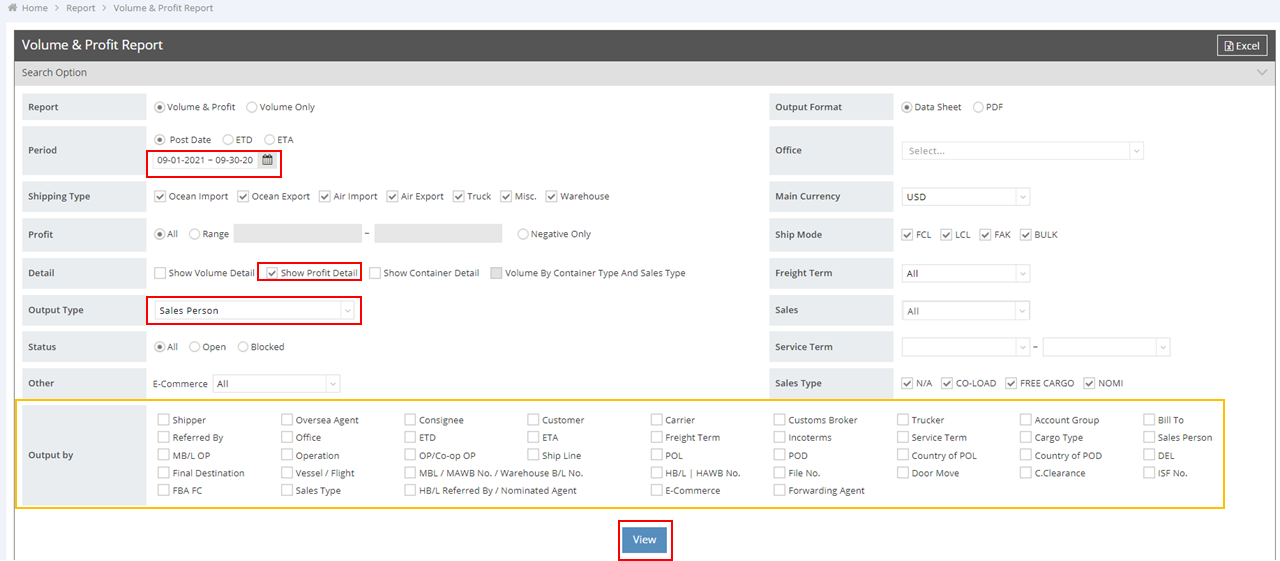 - Set the conditions: specify the "Period" and enable "Show Profit Detail". Note: the Post Date in the Volume & Profit Report is the Shipment Post Date.