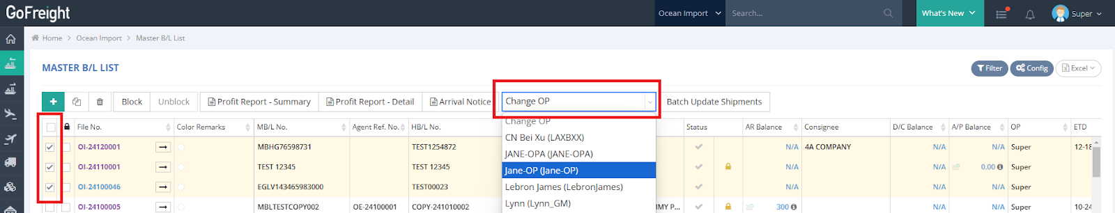 Currently, the feature “Change OP” in the batch is only available in the Ocean Import module and in both the Master B/L List and the House B/L List. With this feature, you can change the Operation in charge in batch at once for multiple shipments.