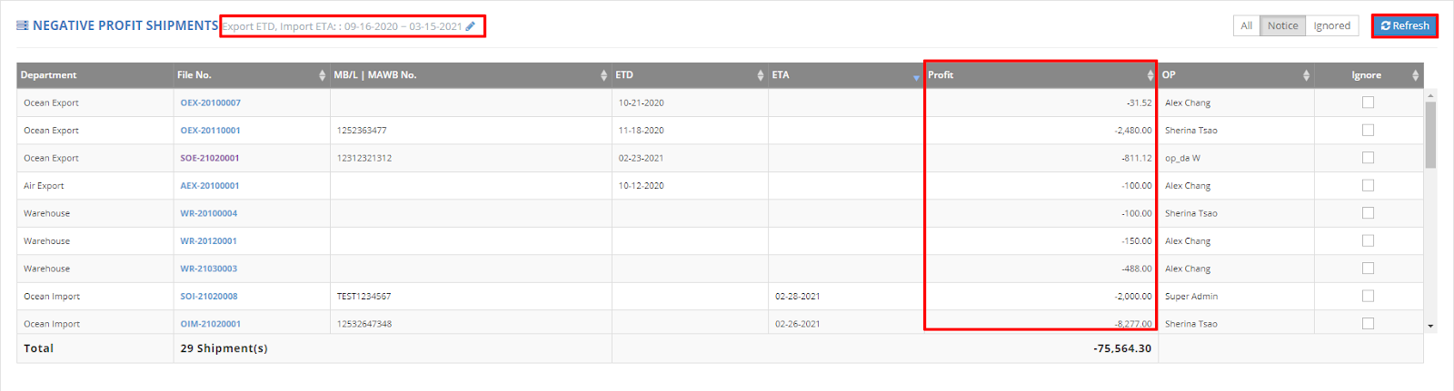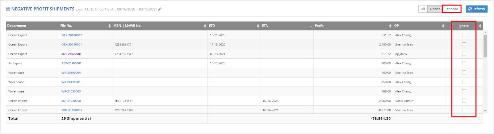 If you prefer not to view negative profit shipments, simply check the 'Ignore' box to exclude them from your report.