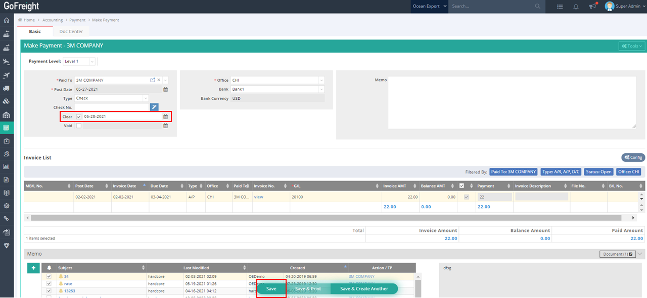 - On the Make Payment entry page, check the "Clear" box and select a date. Click "Save".