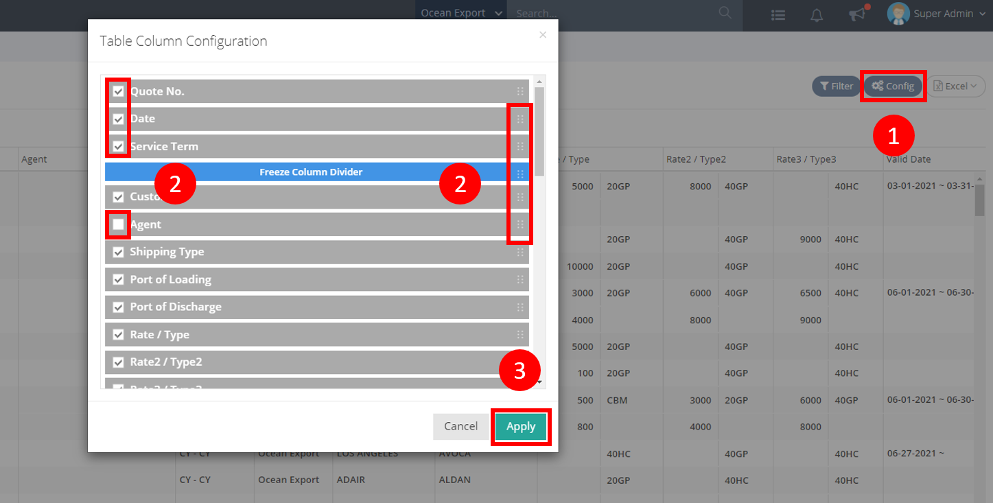 1. Click on Config to open a pop-up screen “Table Column Configuration”.