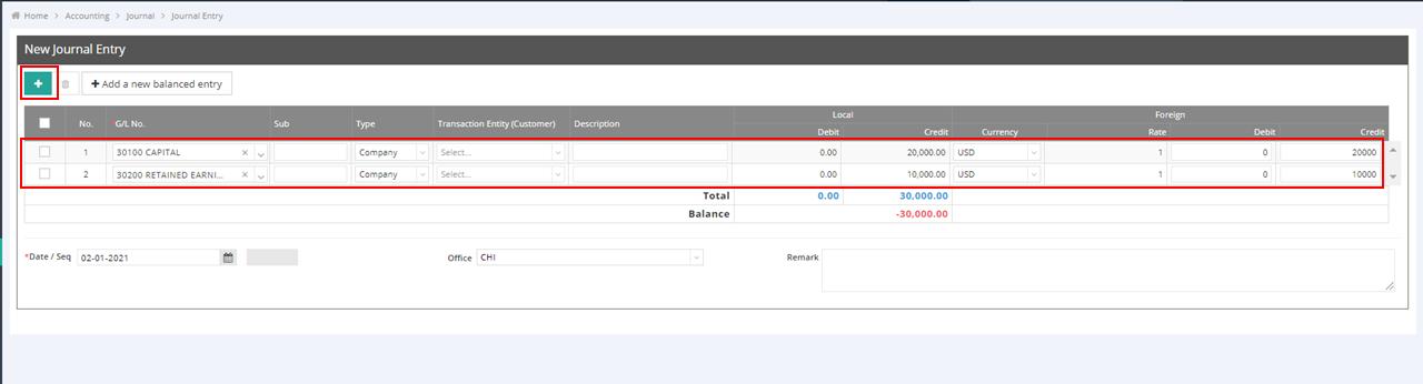 - Click “Add a new balanced entry” for the debit side, and the amount will be automatically filled to $30,000. Enter the G/L code for the bank where you want to make the deposit.