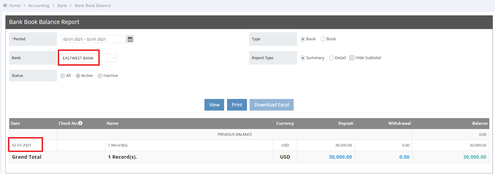 To verify if the amount has been deposited into your bank account, navigate to “Accounting” > “Bank” > “Bank Book Balance” in the navigation bar.