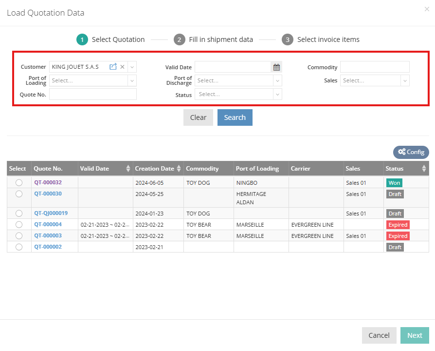 - In the pop-up window, filter quotations based on Customer, Valid Date, Commodity, Port of Loading(POL), Port of Discharge(POD), Sales, Quote No., and Status.
