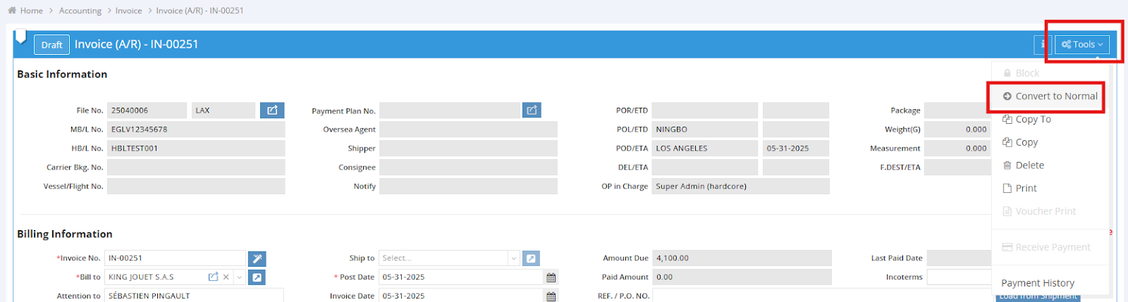 - Finalizing the Draft Invoice: If the invoice is in draft mode, convert it to a normal invoice by clicking "Tools" and selecting "Convert to Normal." This enables you to print or send the confirmed invoice to your customer.