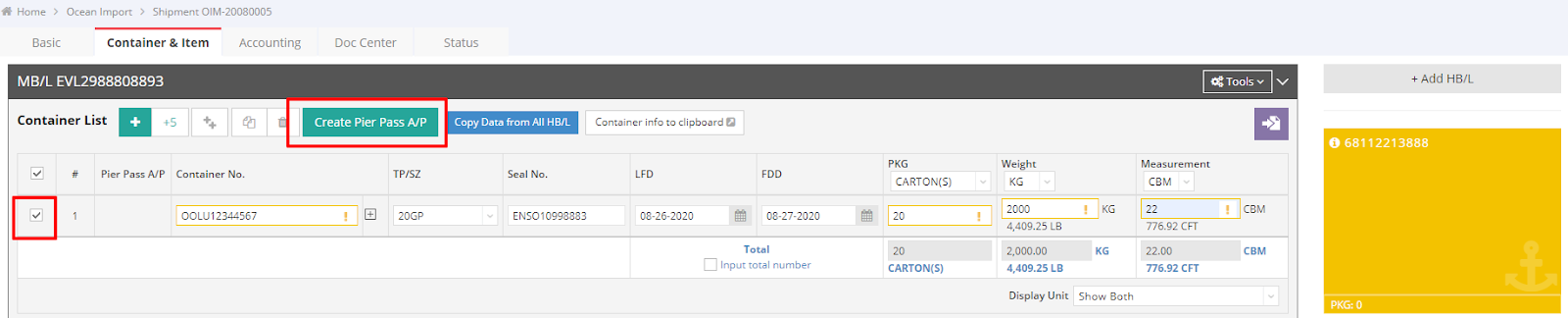 - Select the container for which you want to create a Pier Pass fee, then click “Create Pier Pass A/P.”
