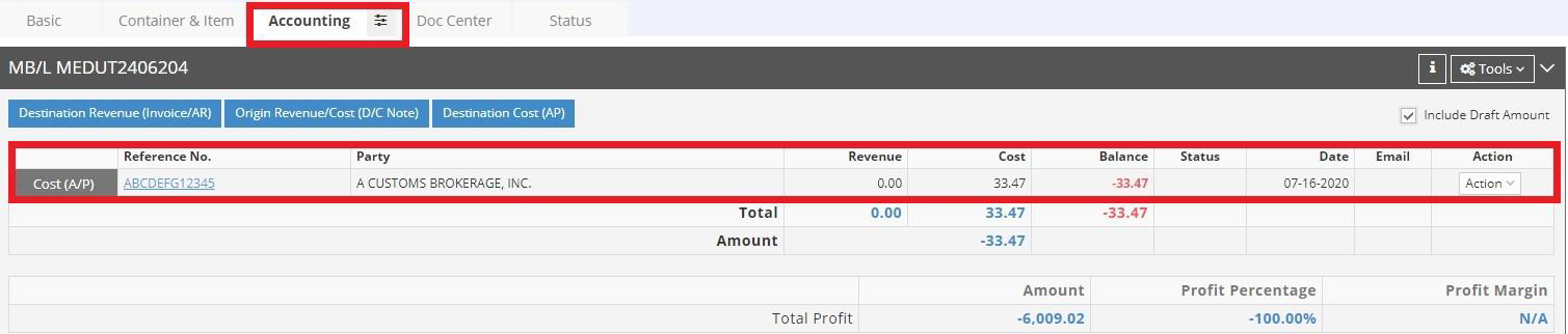 - To verify that the Pier Pass has been created, navigate to the “Accounting” tab and check for a new Cost (A/P). If it appears, you have completed the process successfully.