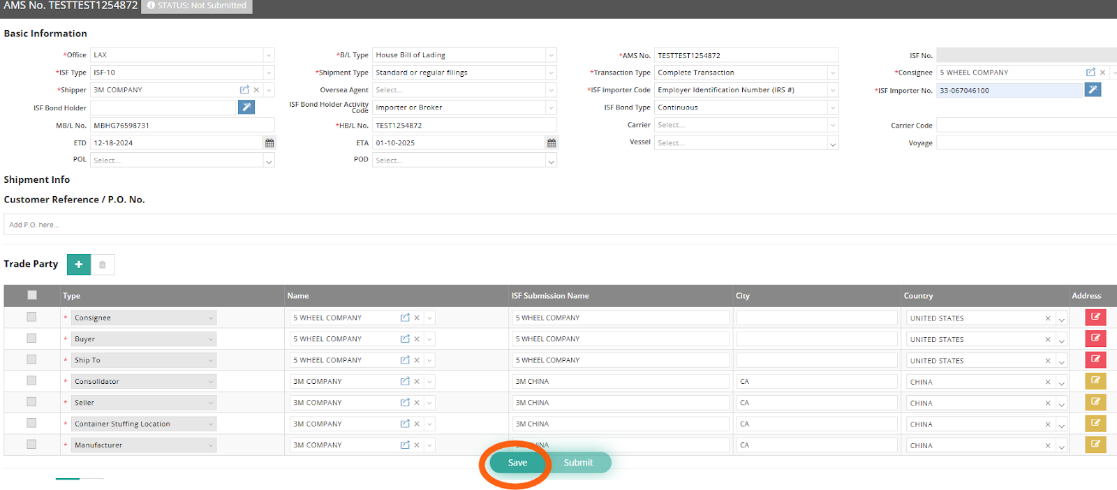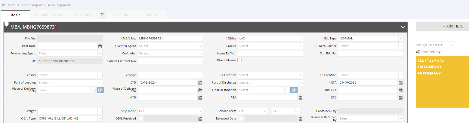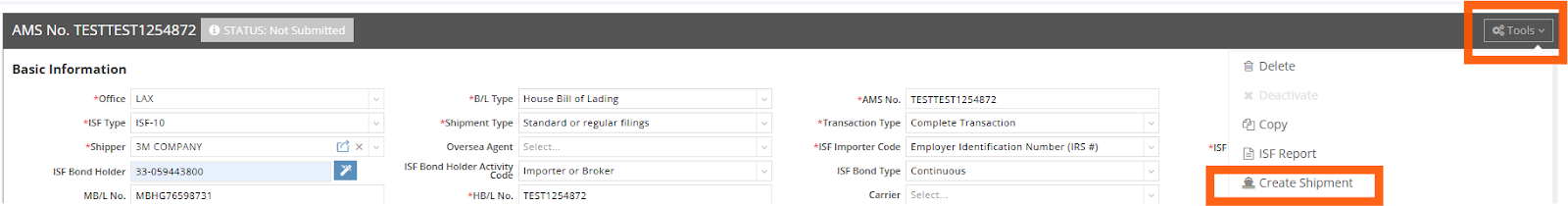 - You will be redirected to the shipment entry page under the Ocean Import module. The system will pre-fill the shipment info with the data you entered in the ISF.