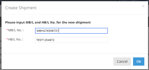 - A pop-up message titled Create Shipment will appear to confirm both the MB/L and HB/L No. Click “OK” to proceed.