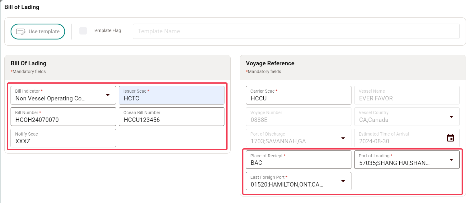 3-2. For creating a new Bill of Lading, fill in the required information and pay attention to the following fields:
