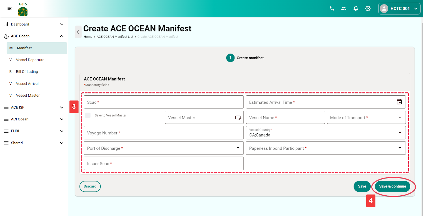 - Vessel Country Code: Enter the country code to save the vessel info into the Vessel Master under the Manifest menu for future reference.