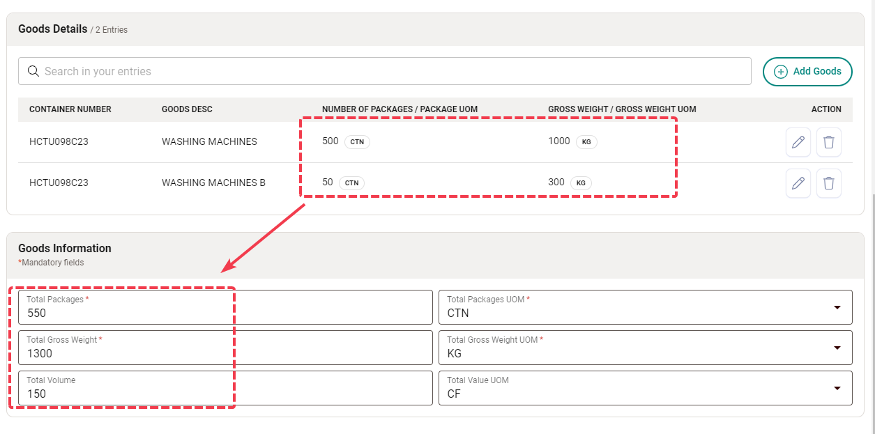 3-6. After completing the Goods Details, the total amount of goods will be automatically calculated and displayed in the Goods Information section. When all necessary information is filled, click the Save button to finalize the Bill of Lading creation.