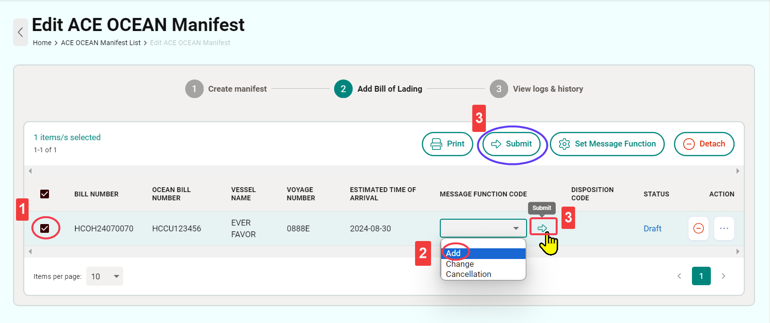 3-1. On the ACE OCEAN Manifest page, you can add a Bill of Lading in two ways: