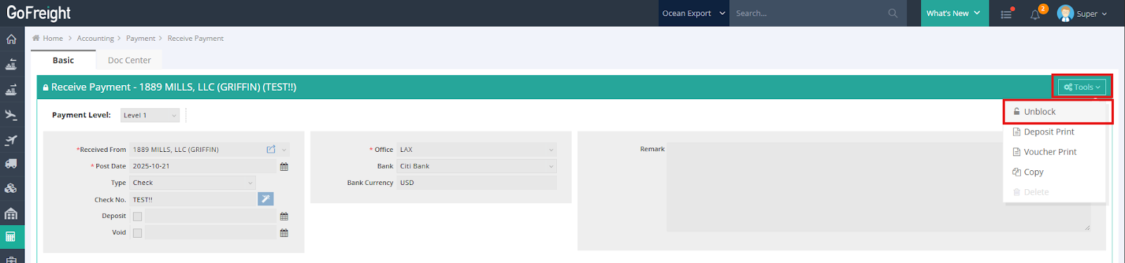 By default, users with the Accounting Block/Unblock and Accounting Block Maintenance access can unblock payments: