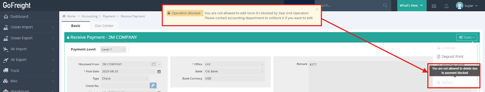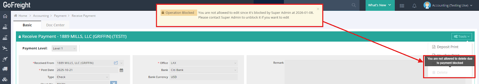- In the Tools menu, the Delete option will appear greyed out. If you hover your mouse over it, a small tooltip will appear saying: “You are not allowed to delete due to payment blocked.”