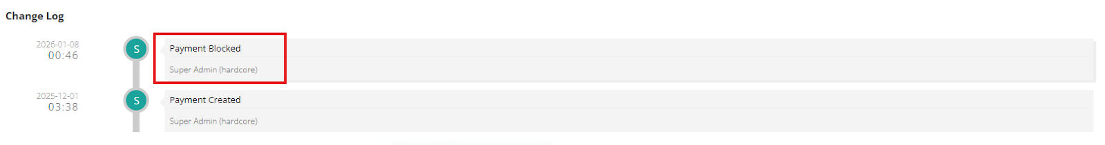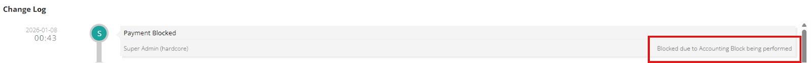 At the bottom of the page, the Change Log will show a record of the payment being blocked.