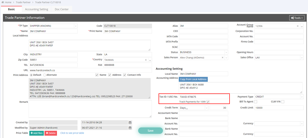 - Enter the Tax ID and check the box for “Track Payments for 1099”. Then, click “Save”.