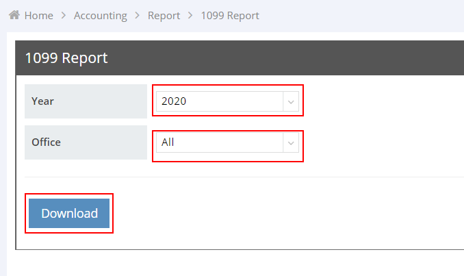 - In the 1099 Report section, select the Year and Office, then click “Download”.
