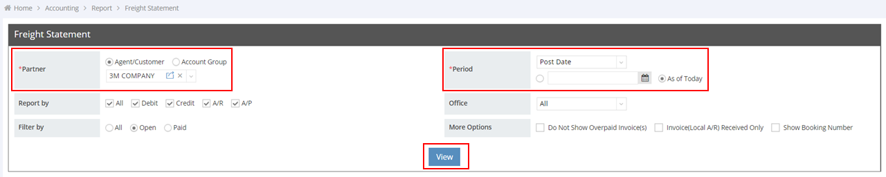 - Navigate to “Accounting” > “Report” > “Freight Statement” on the navigation bar.