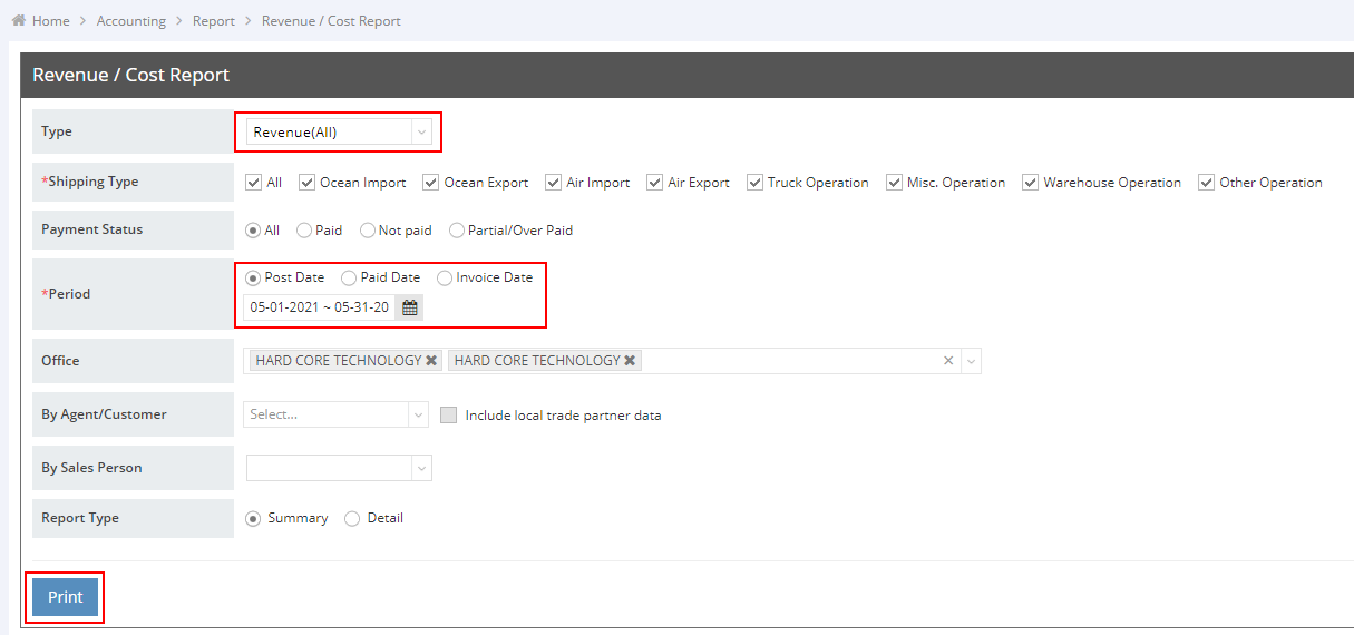 - Navigate to “Accounting” > “Report” > “Revenue/Cost Report” on the navigation bar.