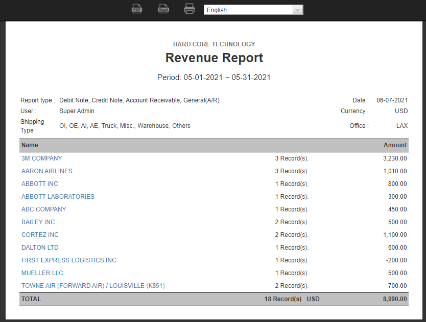 Below is a sample of the Revenue Report. This report shows all customer revenue, including invoices and D/C notes for the selected period. By clicking on the customer name hyperlinks, you can see which invoices and D/C notes contribute to this customer's revenue report.