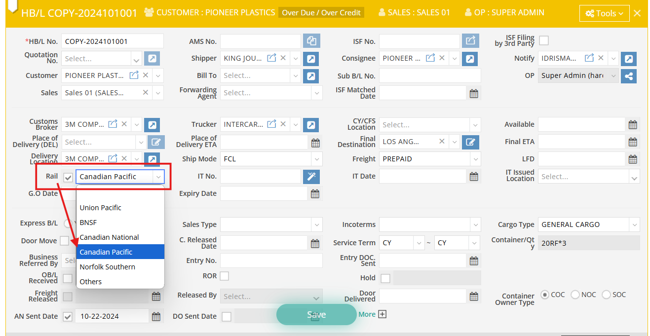 - If you selected Canadian Pacific in the HBL, enter the rail information in the CPRS No. column.