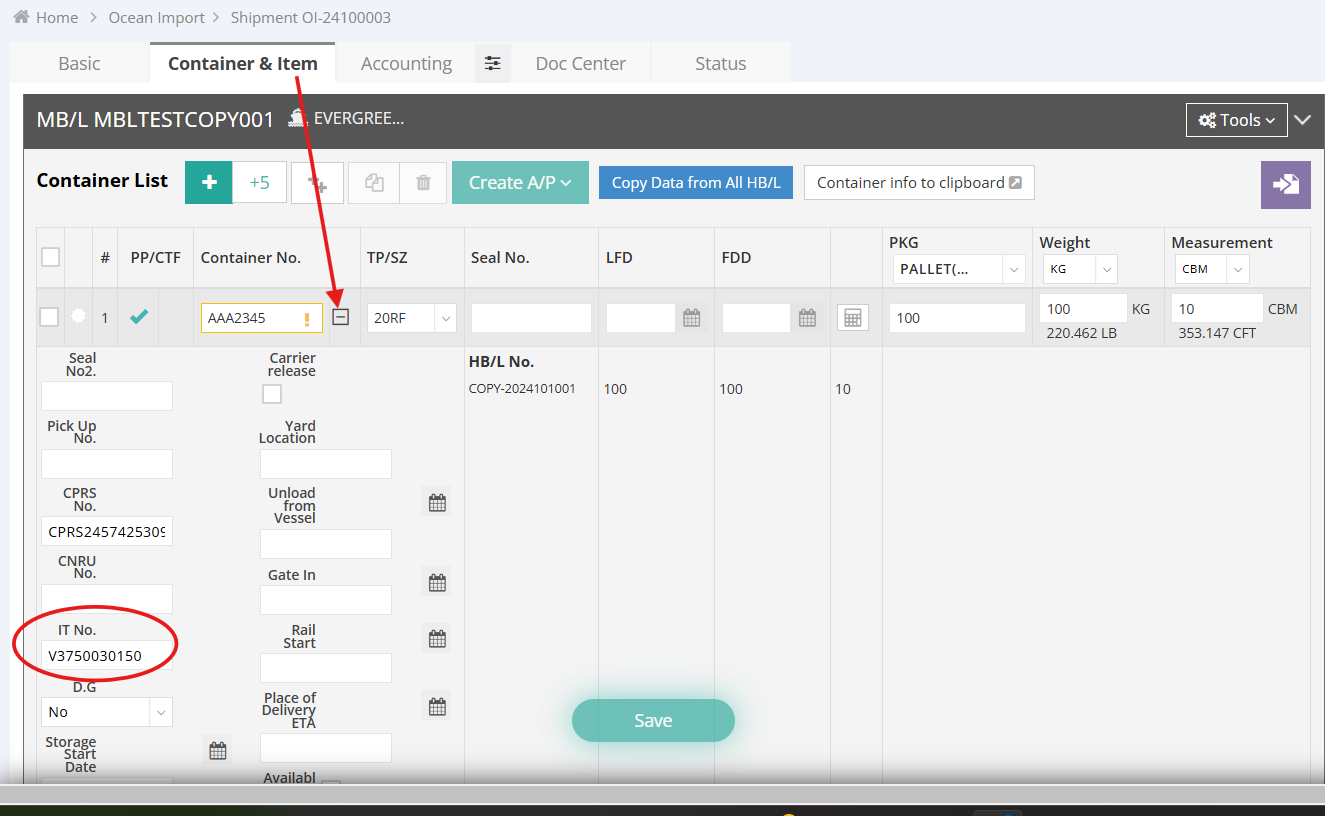 Step 2: Input Rail Details and IT Number in the Container & Item Tab