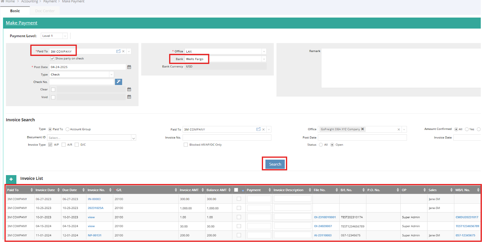 4. After entering “Paid To,” the Invoice Search section will appear below. Click “Search” to display the APs for the selected vendor.