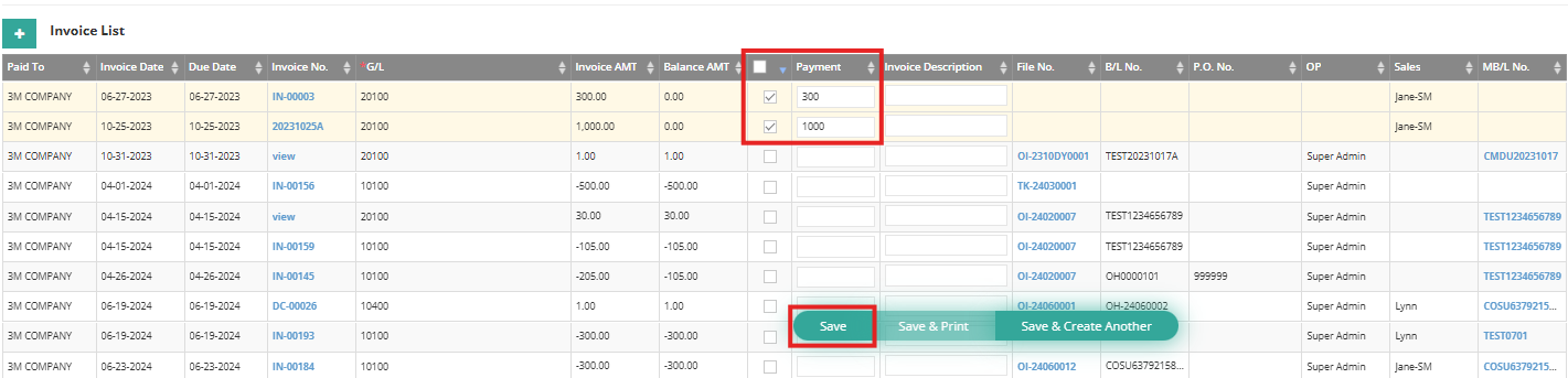 If you are making a partial payment, adjust the payment amount accordingly. For example, if the "Invoice AMT" is $4,000 and you enter $3,000 in the "Payment" field, the "Balance AMT" will display as $1,000.