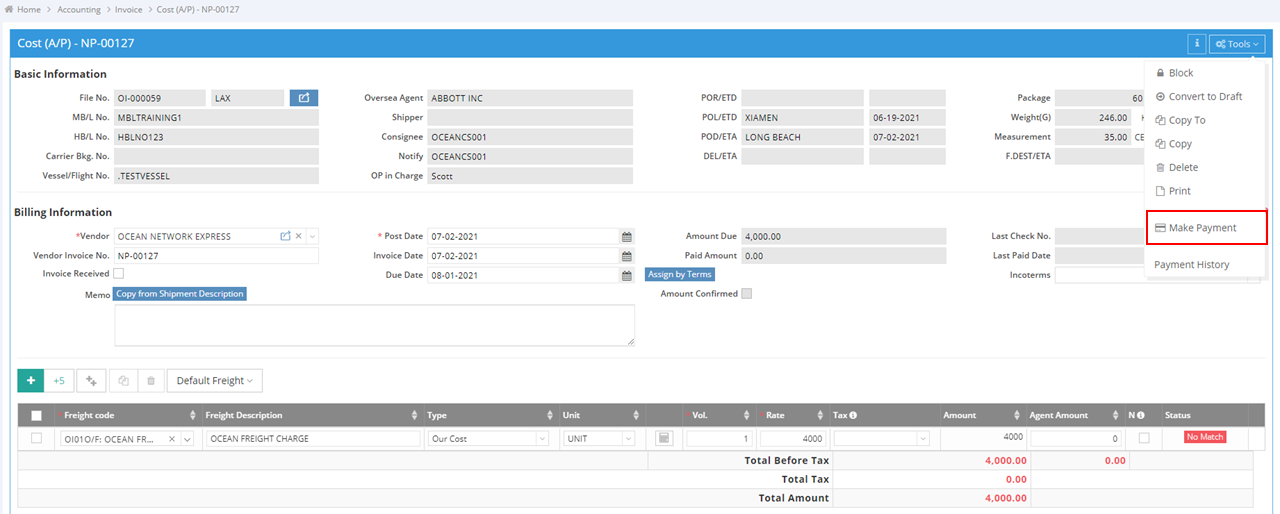 1. Navigate to “Accounting” > “Payment” > “Make Payment” on the navigation bar