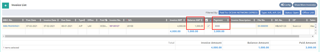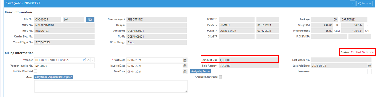 After saving this payment file, the “Status” of the AP invoice will be displayed as “Partial Balance”, and you can view the remaining unpaid amount in the "Amount Due" column.